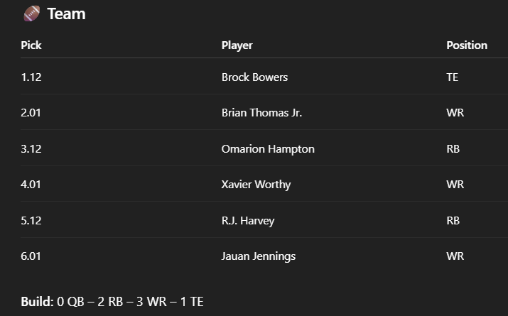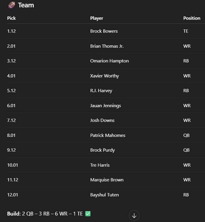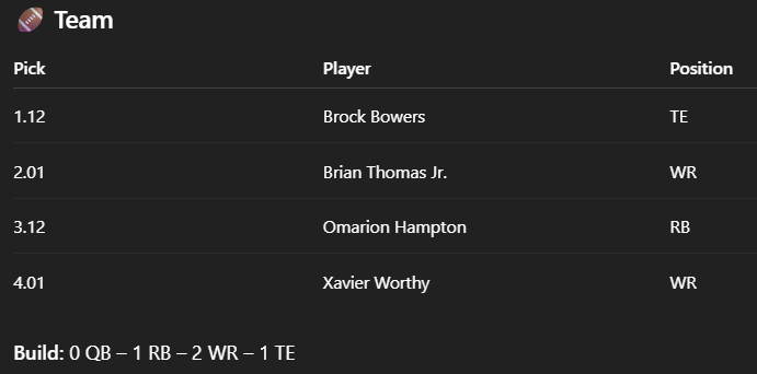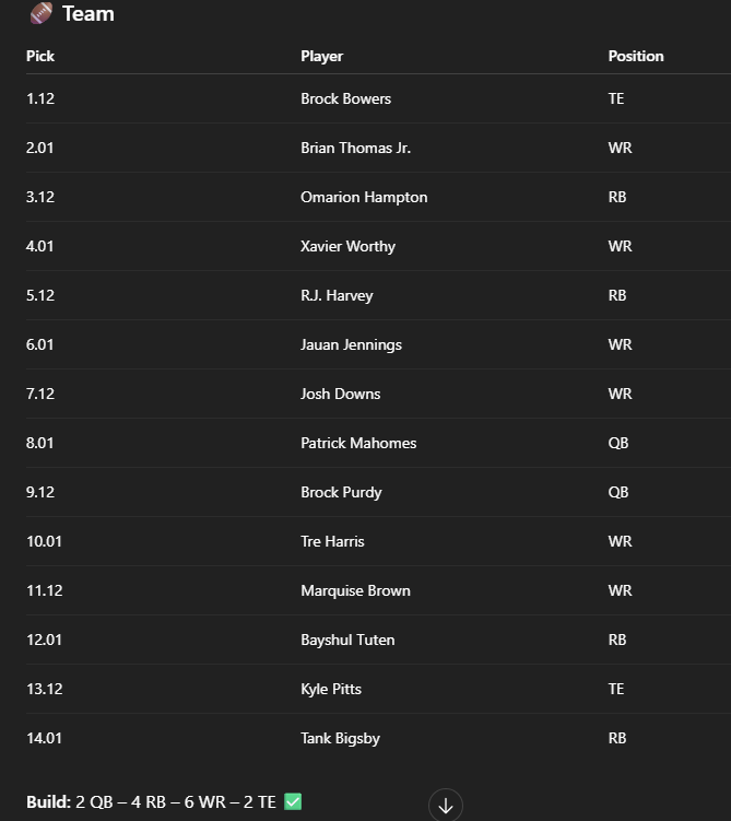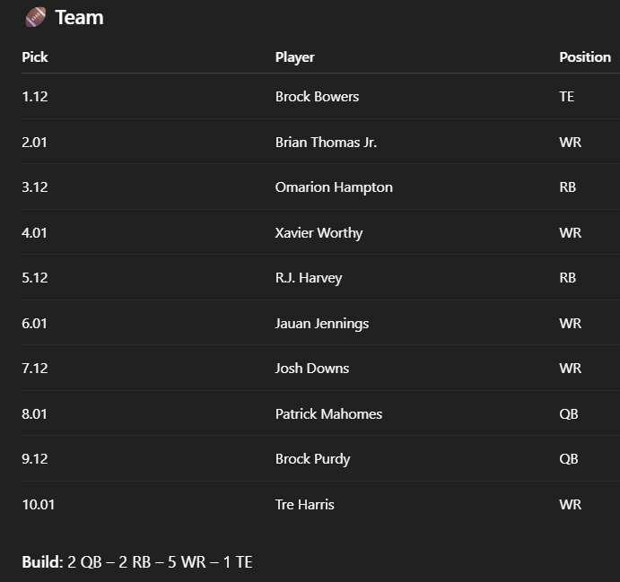 At 10.01, I have a few different options, as Evan Engram and Travis Kelce are also stacking picks at tight end, though neither is a player I’m excited about, especially given I already have Bowers. I probably should go running back here, but in the scenarios where Harvey is the lead back from week one, I’m stronger than ADP would imply. Additionally, there are two awesome picks at receiver, with Tre Harris building out my Chargers bet and Luther Burden playing my Purdy-Jennings stack in week 17. Given I already have a Mahomes-Worthy-Harvey week 17 stack, I’ll pull the ADP/value lever here, getting Harris at 10.01 a few picks after ADP and avoid reaching for the injured Burden.