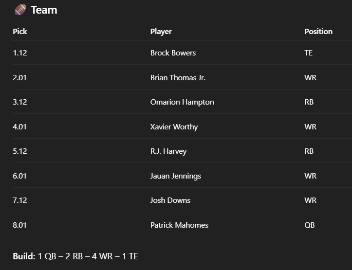 At 8.01, I’ll also select a player I’m in on, despite his ADP falling for most of the spring and summer, in Patrick Mahomes. I wrote up the Mahomes case here, but simply put, Mahomes is likely to lead another passing heavy offense with his best supporting cast in place since 2022. While the Rice suspension complicates his early season outcomes, I expect Mahomes and company to be absolutely humming down the stretch, when best ball fates are truly decided. Given the selection of Worthy earlier, I’m thrilled to add Mahomes at ADP at 8.01, and which leads me to the