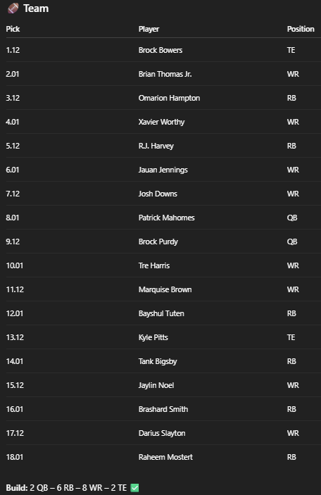 With my last four picks, I’m likely looking at 2 running backs, one receiver, and one free pick. 15.12 is the easiest pick, as Jaylin Noel is available, who is my favorite round 3 rookie receivers, a week 17 correlation with Hampton and Harris, and one of my most drafted players so far. I’m going to reach ahead of ADP to select Brashard Smith at 16.01. Smith comes with real risk of being a zero, but he builds out my season-long bet on the Chiefs and is a correlated week 17 piece. At 17.12, I’ll select Darius Slayton, who offers early season routes, and is a correlated spike option with Bowers in week 17. And finally, at 18.01, I’ll pick Raheem Mostert, who probably sees some early work and offers contingent value if Ashton Jeanty misses time.